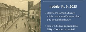 V neděli 14. 9. se můžete těšit na vlastivědnou vycházku Čáslaví s PHDr. Janou Vaněčkovou v rámci Dnů evropského dědictví. Sraz v 16:00 u pomníku Jana Žižky z Trocnova na náměstí. Přijďte se ponořit do historie.