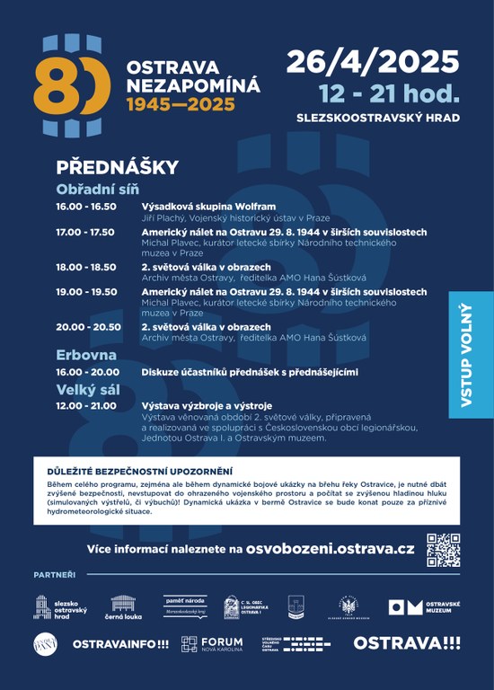 Oslavy 80. výročí osvobození jsou velkou veřejnou akcí, kde je očekávána přítomnost značného množství lidí, navíc zde dojde k rekonstrukci válečných bojů za použití těžké techniky a pyrotechniky. Proto je nutné, aby všichni přítomní dbali své vlastní bezpečnosti, řídili se danými pravidly a drželi se v prostoru určeném k pohybu veřejnosti. Za respektování výše uvedeného děkujeme.